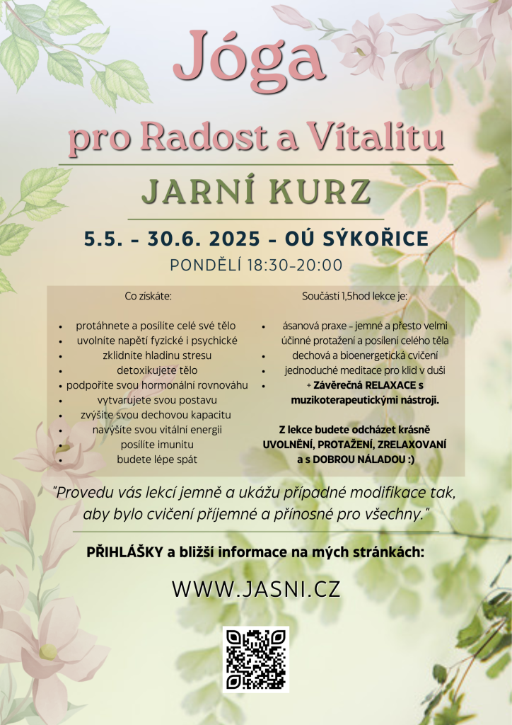Jarní kurz, který se koná od 5. května do 30. června 2025, nabízí účastníkům možnost protáhnout a posílit své tělo pomocí ásanové praxe a dalších technik. Každé pondělí od 18:30 do 20:00 se zaměříme na uvolnění napětí, zklidnění stresu a podporu hormonální rovnováhy. Součástí kurzu jsou i meditace a relaxace s muzikoterapeutickými nástroji. Přihlaste se na našich stránkách pro více informací