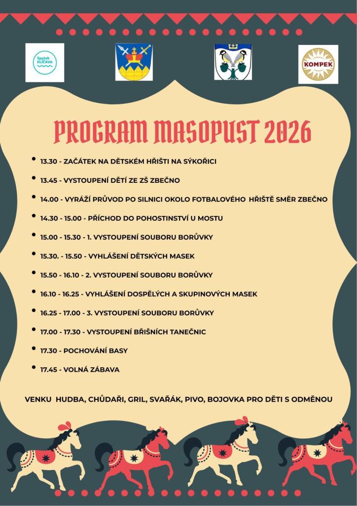 V sobotu 7. února 2026 se na Sýkořici a ve Zbečně uskuteční tradiční MASOPUST. Bohatý program pro celou rodinu začíná ve 13:30 na dětském hřišti u OÚ Sýkořice. Přijďte si užít příjemné odpoledne s hudbou, grilováním a občerstvením. Těšíme se na Vás