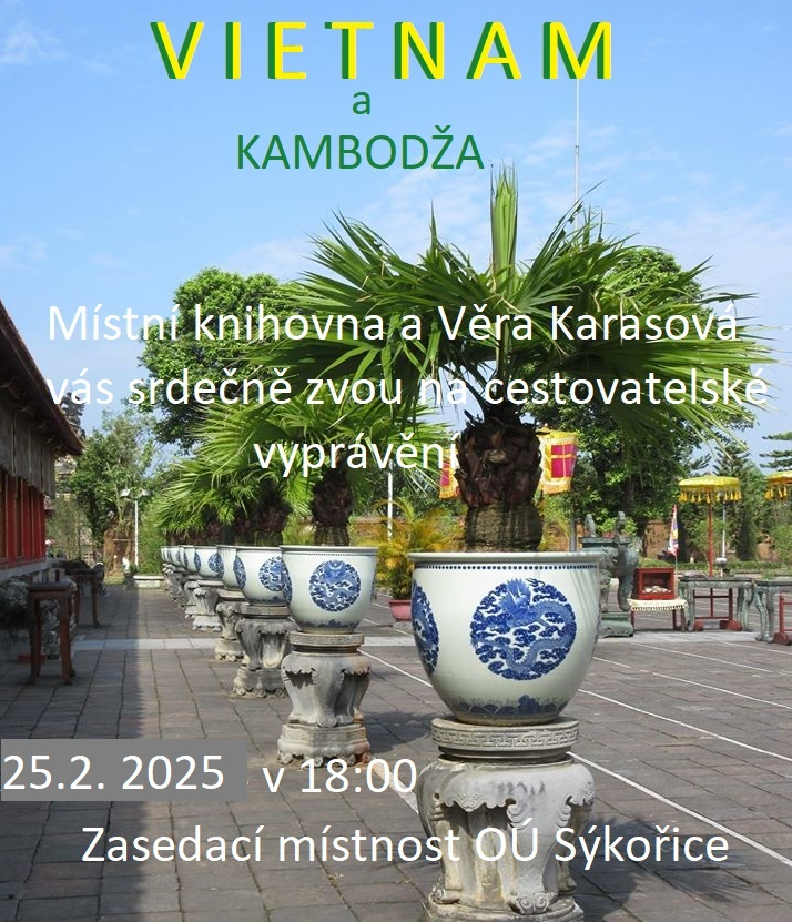 Vietnam a Kambodža jsou destinace plné unikátních zážitků. Od nádherných přírodních scenérií po bohatou kulturu a historii, tyto země nabízejí cestovatelům mnoho možností. V našem vyprávění najdete praktické tipy, které vám pomohou naplánovat nezapomenutelnou cestu. Těšíme se na Vás v úterý 25.2.2025 od 18:00 v zasedací místnosti OÚ Sýkořice.