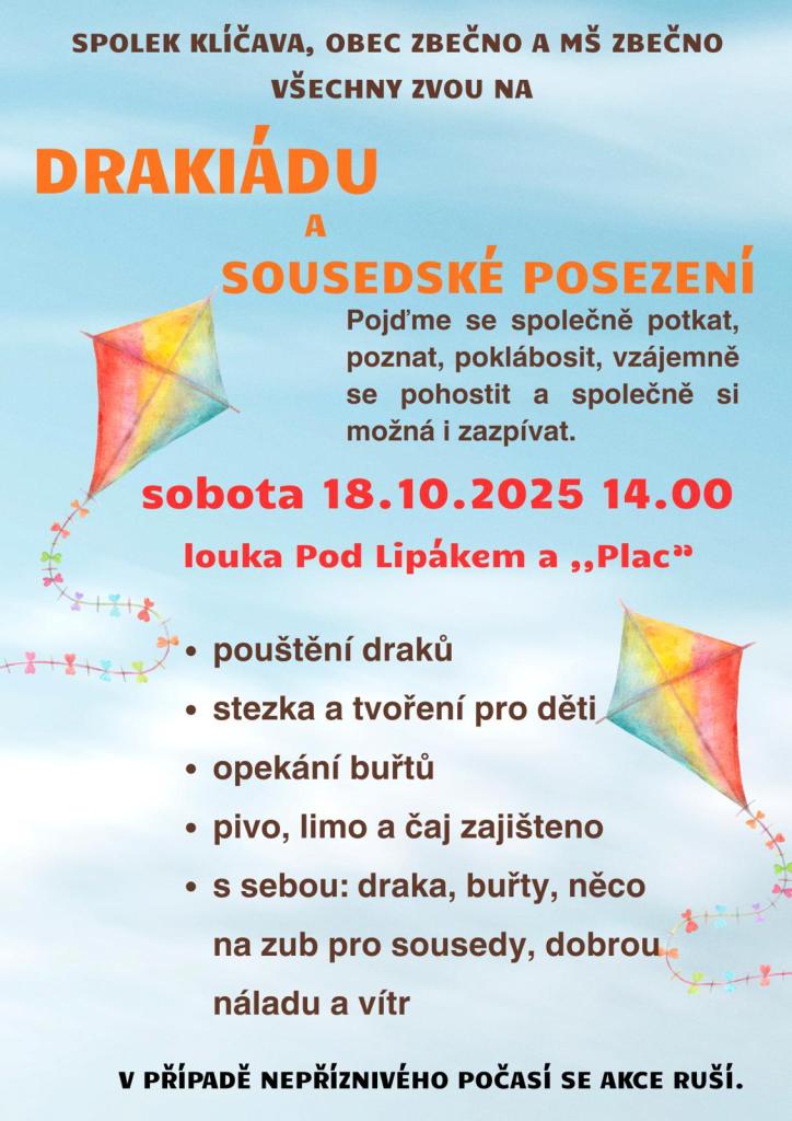 Spolek Klíčava, obec Zbečno a MŠ Zbečno srdečně zvou všechny na drakiádu a sousedské posezení, které se uskuteční v sobotu 18. října 2025 od 14:00. Akce proběhne na louce Pod Lipákem v Újezdě nad Zbečnem, kde si můžete užít pouštění draků, tvoření a stezku pro mladé návštěvníky. K dispozici bude opékání buřtů a občerstvení jako pivo, limonáda a čaj. Nezapomeňte si přinést nejen svého draka, ale také něco na zub pro sousedy a dobrou náladu. V případě nepříznivého počasí se akce ruší.